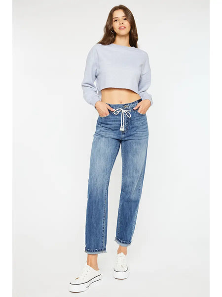 Slouch fit drawstring regular hem jean Rigid Five-pocket style Single cuff 11.25" rise, after 1.5" fold 27" inseam in size 5 100% cotton 13 oz