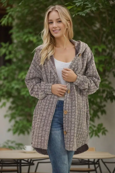 LONG PUFF SLEEVE CHECKER BOUCLE FABRIC BUTTON DOWN CARDIGAN WITH SIDE POCKET AND DOLPHIN HEM DETAIL MODEL SIZE: HEIGHT 5'6", BUST 32", WAIST 24", HIPS 32" WEARING SIZE: SMALL
