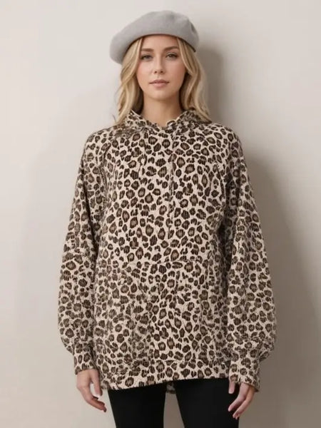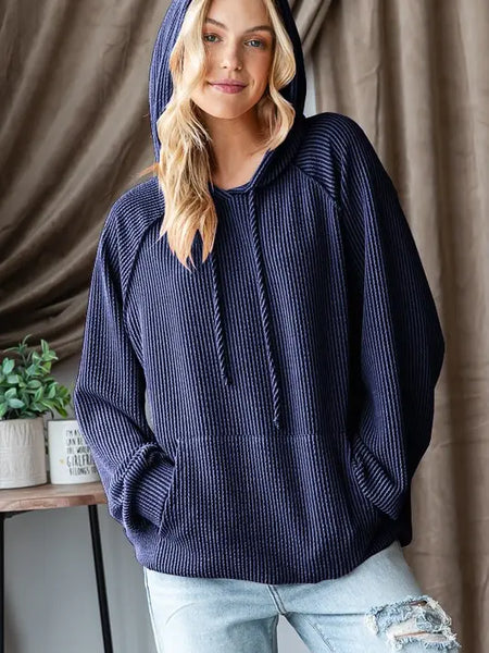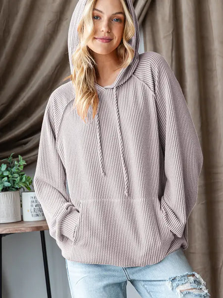95% POLYESTER 5% SPANDEX LONG PUFF SLEEVE DRAWSTRING HOOD SOLID URBAN RIBBED HOODIE TOP WITH KANGAROO POCKET AND STITCH DETAIL