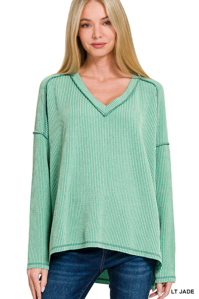 RAISED RIB LONG SLEEVE HI-LOW V NECK TOP- EXPOSED SEAM- RELAXED FIT